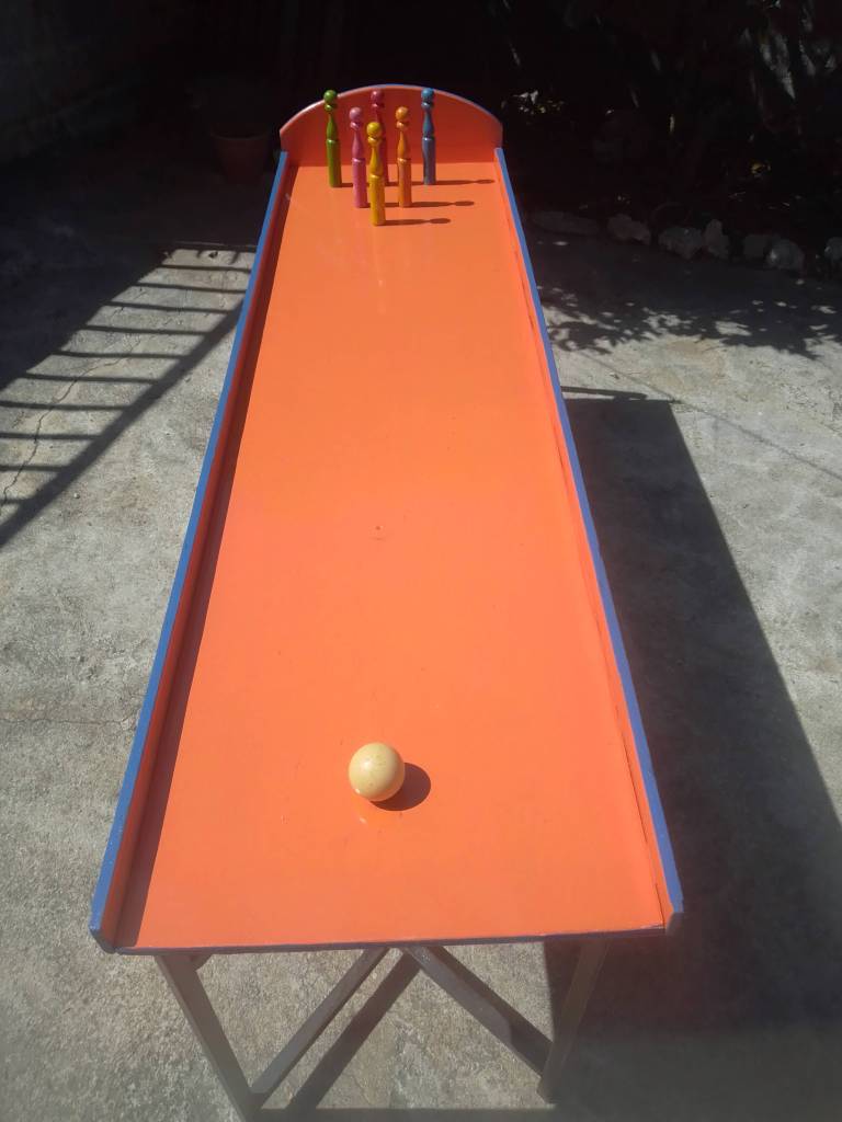 Audacieux mélange de billard et de bowling, il faut dégommer les mini-quilles avec une boule… à l’aide d’une canne de billard!