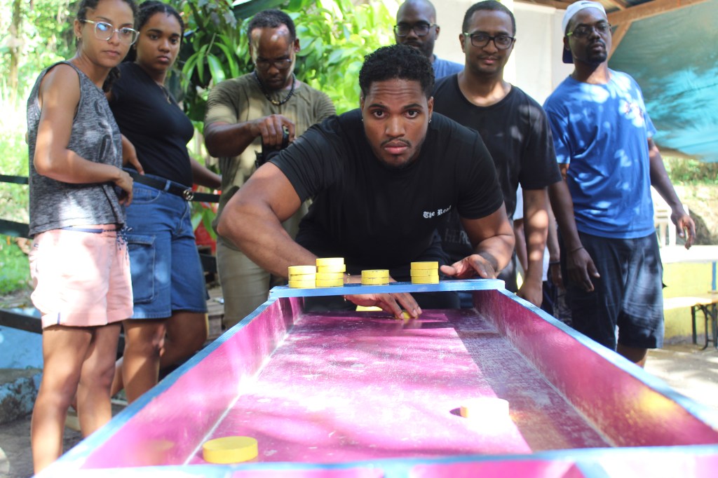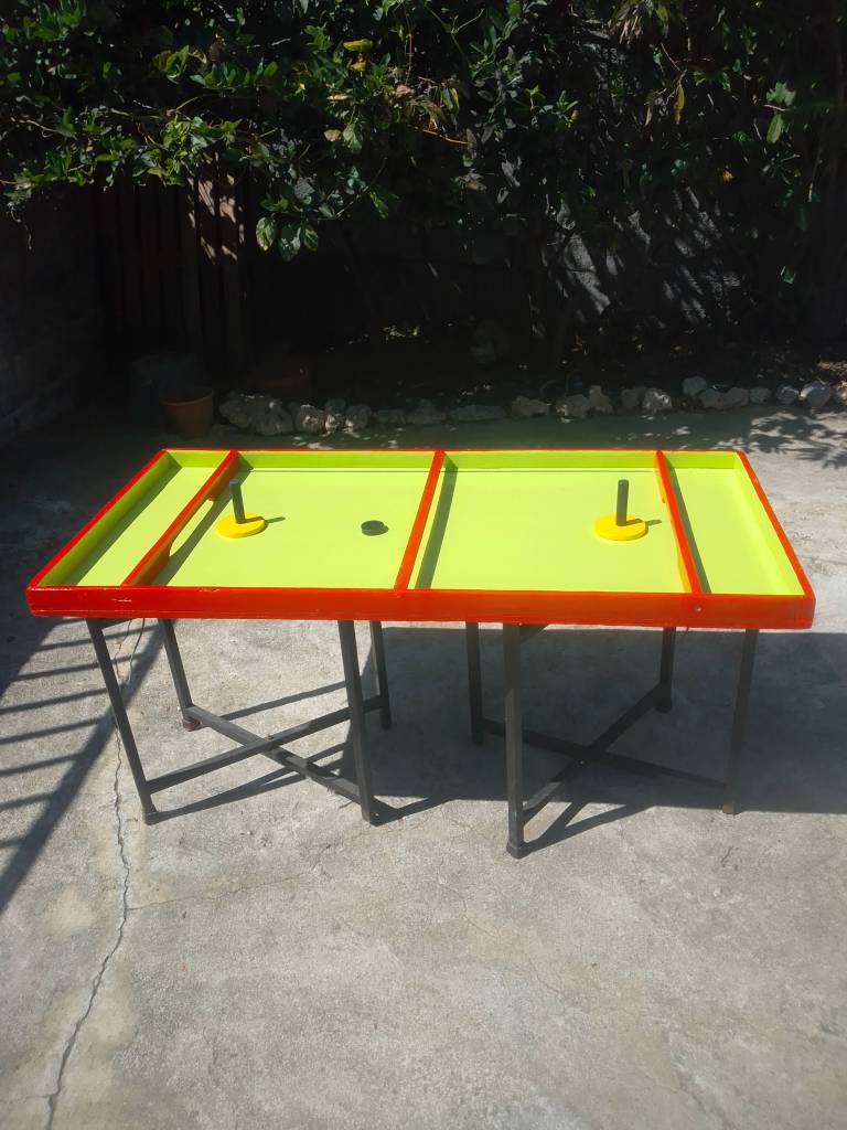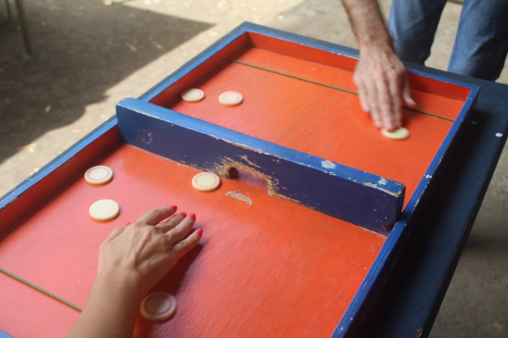 Ce billard se joue à deux, trois ou quatre, à tour de rôle les joueurs font glisser des palets pour les rentrer dans les casiers… précision, adresse et self-control au rendez-vous !